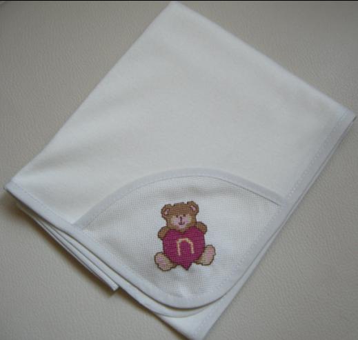 A Nídia está quase a nascer e irá receber de presente este conjunto fralda+babete ursinho com coração em tons rosa e creme.