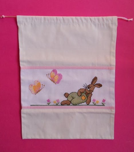 Saco em tons cru com barra rosa bébé - 100% Algodão - Tamanho 40x30cm